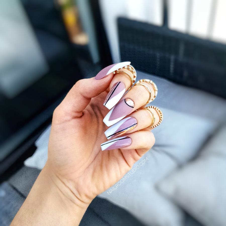 Couleur mauve nude avec des lignes blanches d'inspiration française moderne, des accents noirs et du chrome doré.