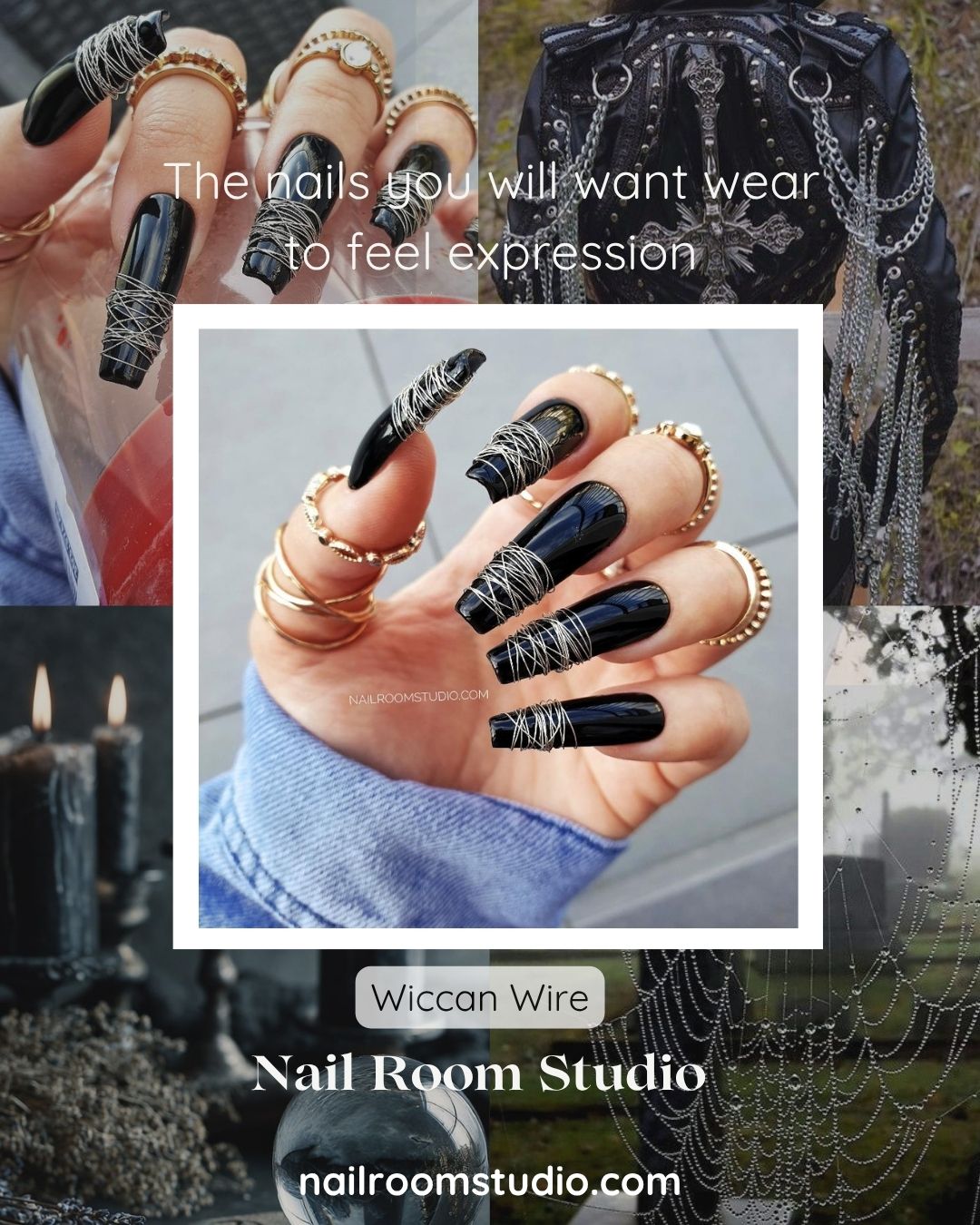 Ongles noirs brillants avec du vrai fil fin autour de toutes les pointes.
