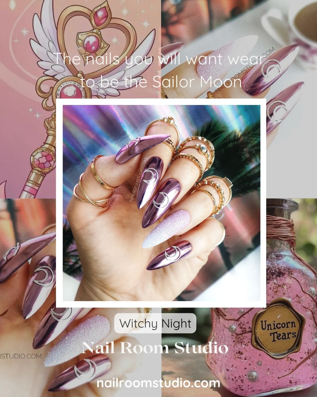 Ongles chromés lilas de sorcière avec des accents métalliques et des ongles pailletés ombrés structurels.
