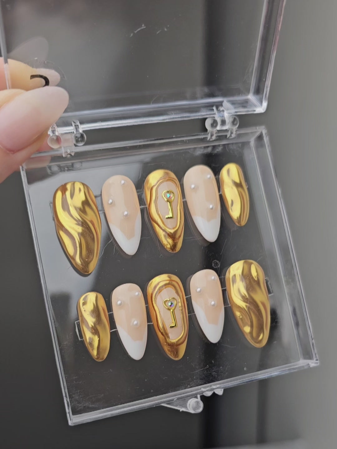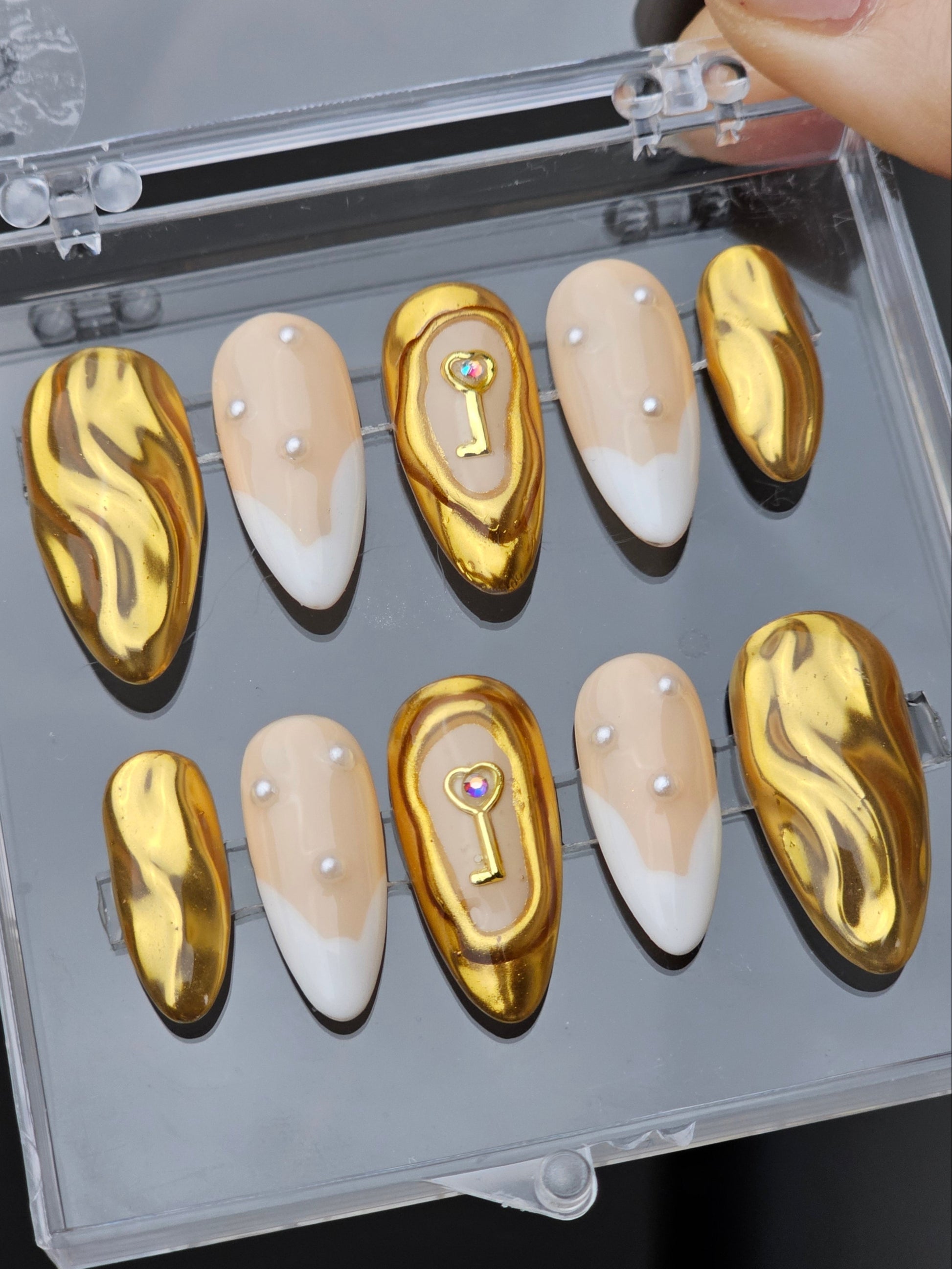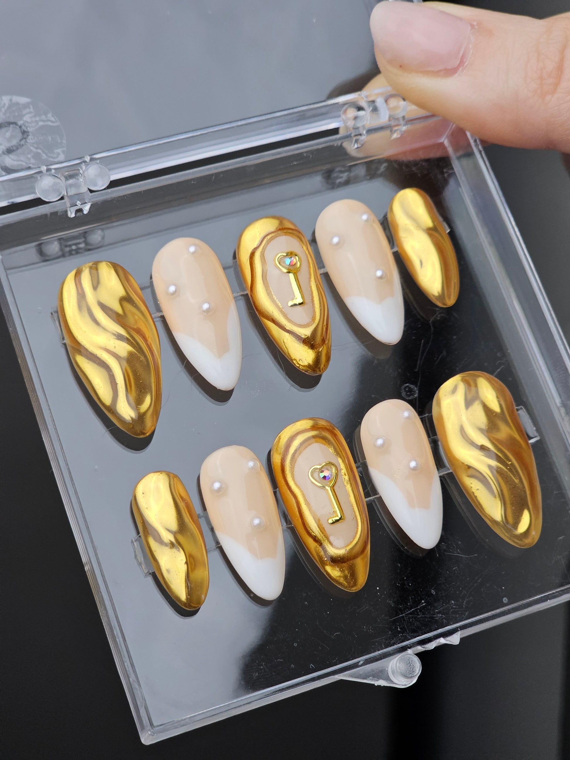 Elevate your nail game with this enchanting set of faux nails! Featuring intricate 3D structural gold waves, a delicate key charm with a sparkling gemstone—like the key to a secret garden—and a dreamy cloudy white french tip adorned with white pearls. The soft nude and powdery pink nail bed creates the perfect cozy base for this whimsical design. Ideal for those who love unique, elegant nail art with a touch of mystery.