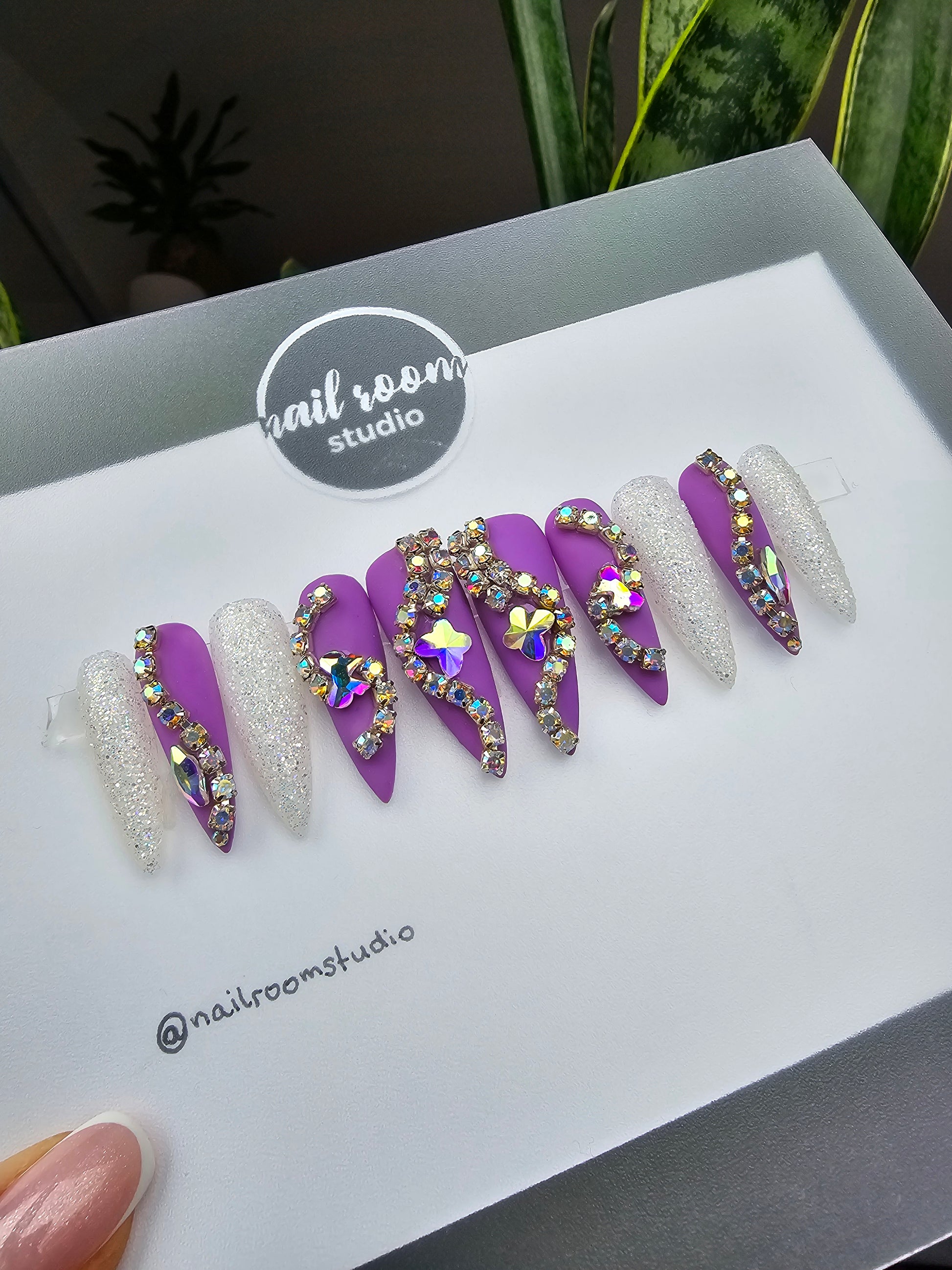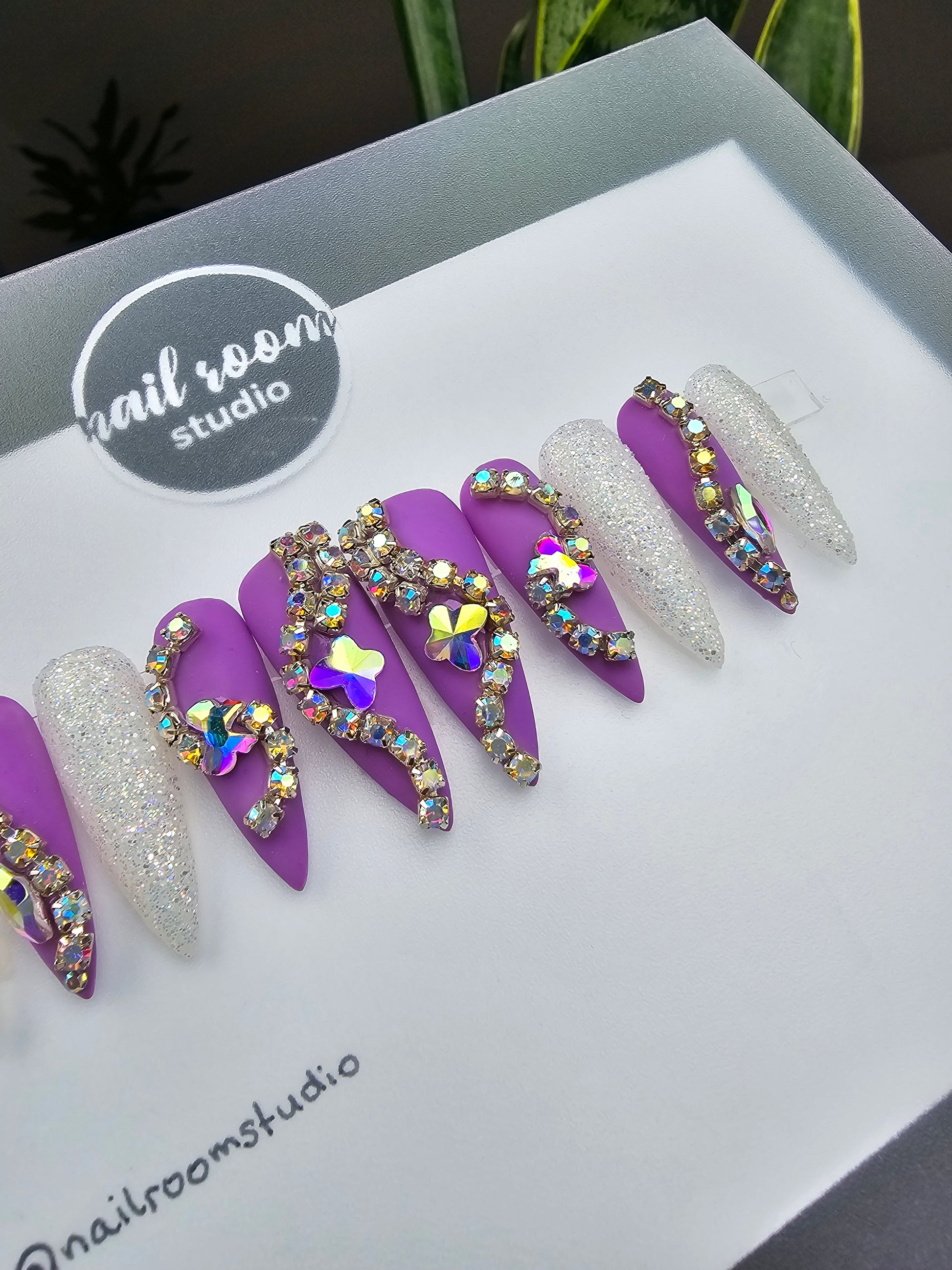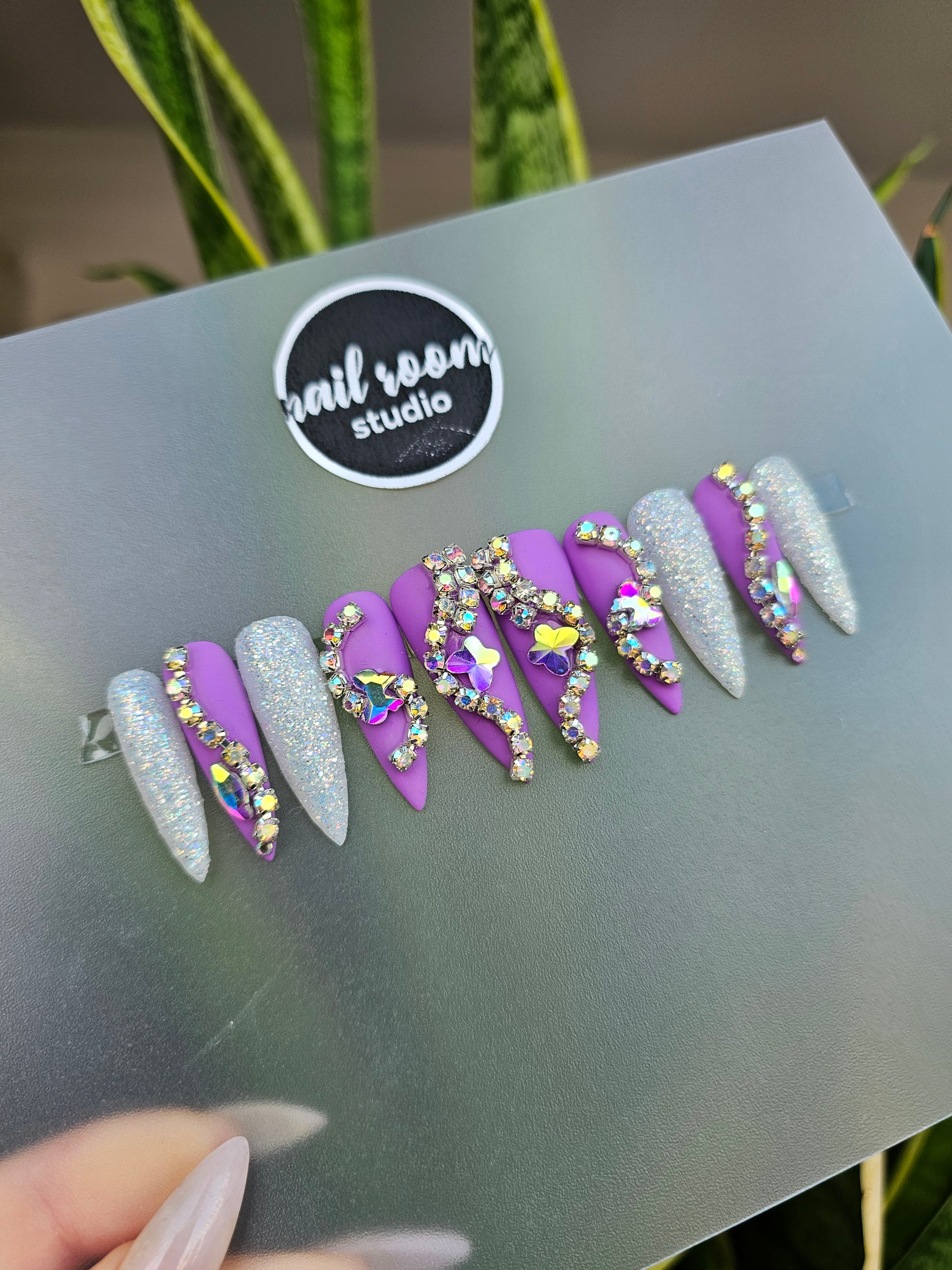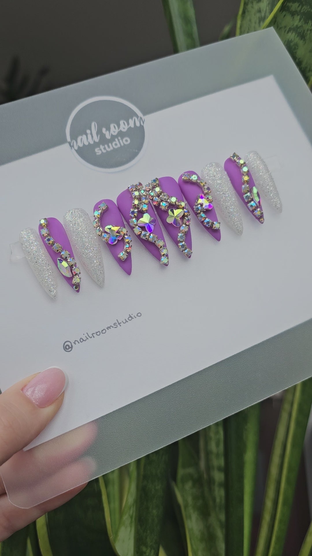 Light purple nails witch crystal chains and structural shimmering Cinderella dust nails and more extra crystal gems.